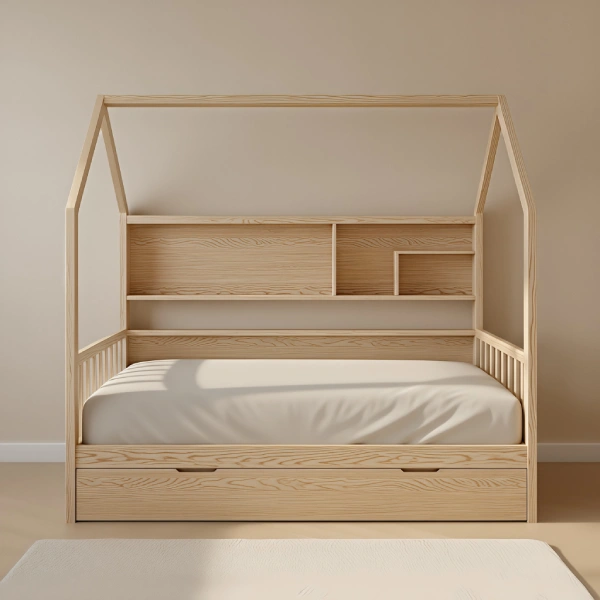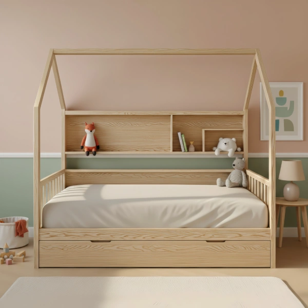 Sleep, play, and stay organised. Our natural wood house Bed Brings the charm of a woodland cabin right into your Child’s bedroom . This Bed has a classic frame for a clean, minimalist look. The storage below is perfect for tucking away extra linens or toys. It also features built in headboard bookshelf for favourite bedtime stories, and an open gable roofline is a blank canvas to decorate the way you want.